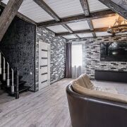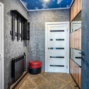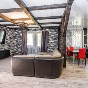 Напольное покрытие: коридор, кухонная зона – плитка, жилая зона – ламинат. В обеденной зоне и зоне отдыха оборудованы электрические тёплые полы.