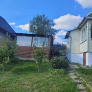 Теплый сухой дом на возвышенности, сборно-щитовой, обшит пластиковыми панелями, пол утеплен минеральной ватой. Крыша - новый шифер. Новая электропроводка. Стеклопакеты. Участок огорожен сеткой-рабицей. Беседка (4Х5 м.) - 5 года. Вода в доме (душ-кабина, стиральная машина) Бойлер. Ухоженый участок, газон, плодовые деревья и кусты. Телефон, интернет. Транспортное сообщение - электричка, маршрутка. Торг!