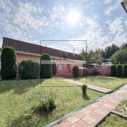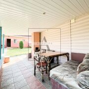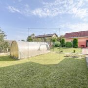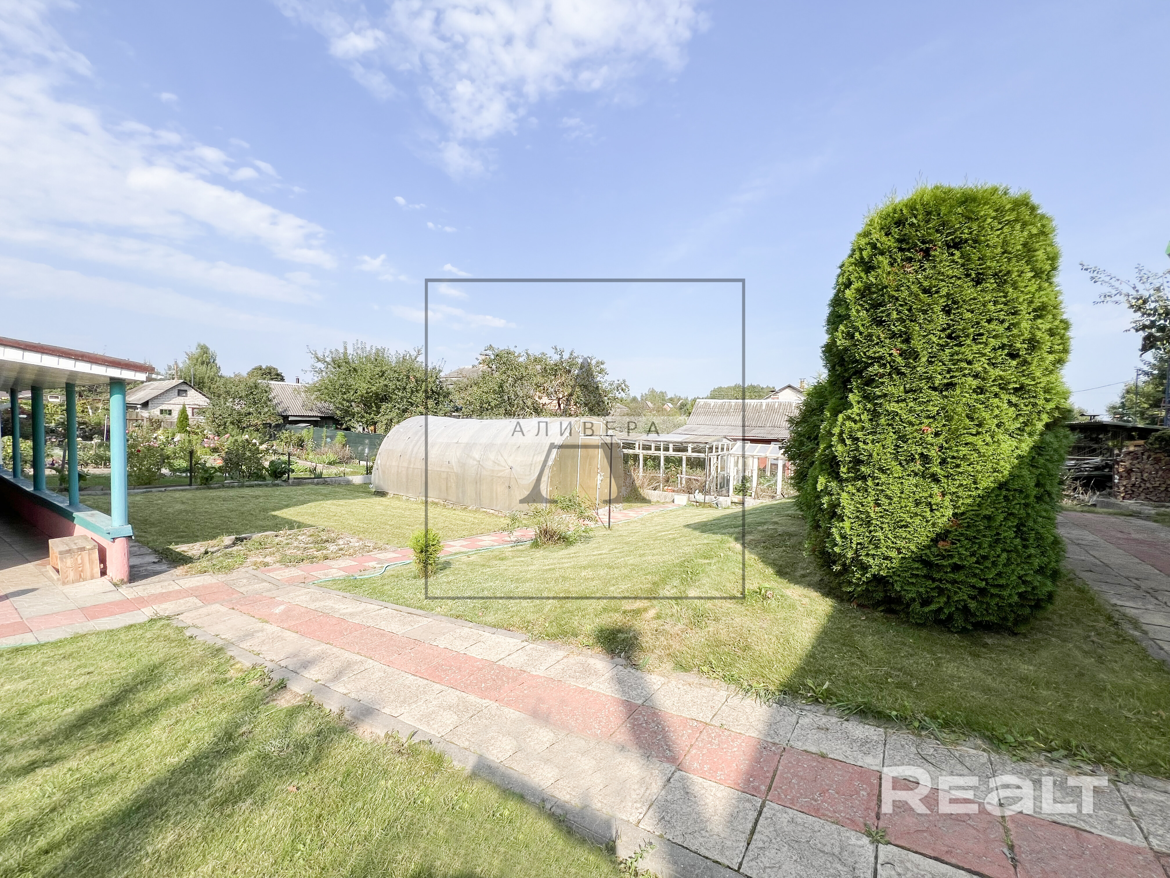 Сделан ландшафтный дизайн, газон, туи, имеется теплица.
