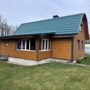 - Теплый и экологичный: брус обложен кирпичом и облицован металлопрофилем.