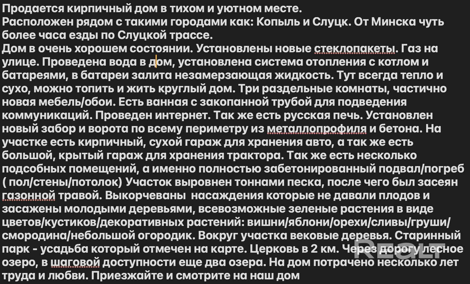 Продается кирпичный дом в тихом и уютном месте. Расположен рядом с такими городами как: Копыль и Слуцк. От Минска чуть более часа езды по Слуцкой трассе. Дом в очень хорошем состоянии. Установлены новые стеклопакеты. Газ на улице. Проведена вода в дом, установлена система отопления с котлом и батареями, в батареи залита незамерзающая жидкость. Тут всегда тепло и сухо, можно топить и жить круглый дом. Три раздельные комнаты, частично новая мебель/обои. Раздельная кухня и ванная с закопанной трубо