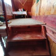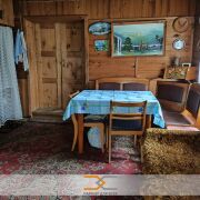 На первом этаже дома расположены веранда, комната с печкой, выделенное пространство для сна и отдыха. На полу доска. Стены и потолок отделаны вагонкой.