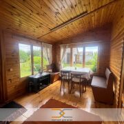 На кухне пол доска, стены и потолок из вагонки. В комнатах пол доска, на стенах обои, потолок отделан декоративными панелями.