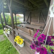 На участке оборудована зона для барбекю с беседкой, где можно проводить вечера на свежем воздухе, наслаждаясь приготовленными блюдами.