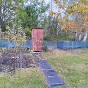 Участок 7 соток, на котором стоит металлический сарай, туалет, зона для беседки, крытый навес для авто, блочный душ.