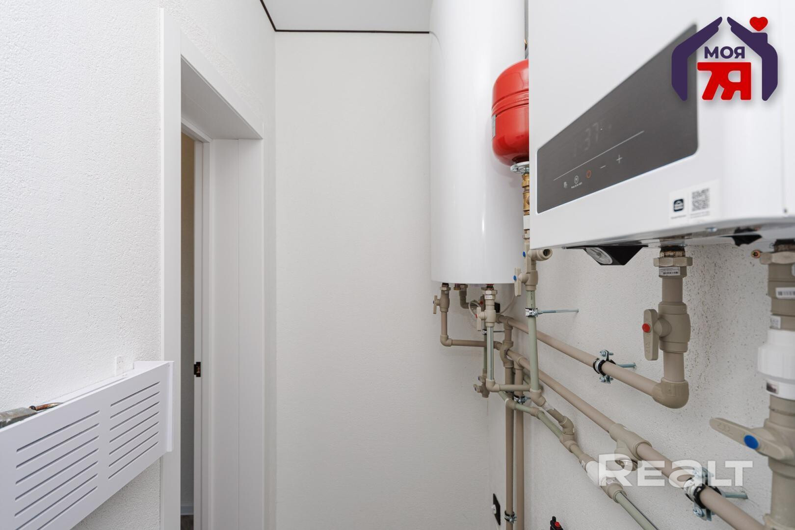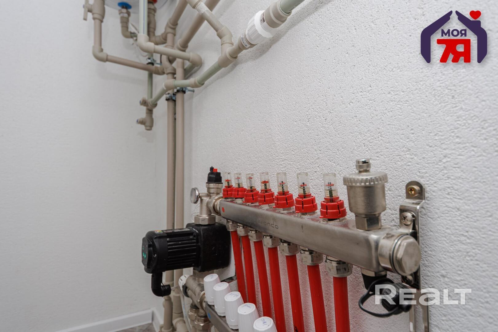 - Теплые полы (водяной) по всему полу дома, уложена плитка. Топится электрокотлом, установлен накопительный водонагреватель. По дому разведен интернет; в ближайшее время проведут оптоволокно.