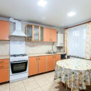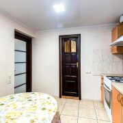 -На кухне установлен современный кухонный гарнитур с встроенной техникой и продуманной системой хранения. Керамическая плитка на стенах и полу облегчает уборку и придает помещению аккуратный, опрятный вид.