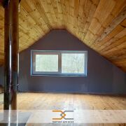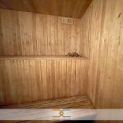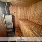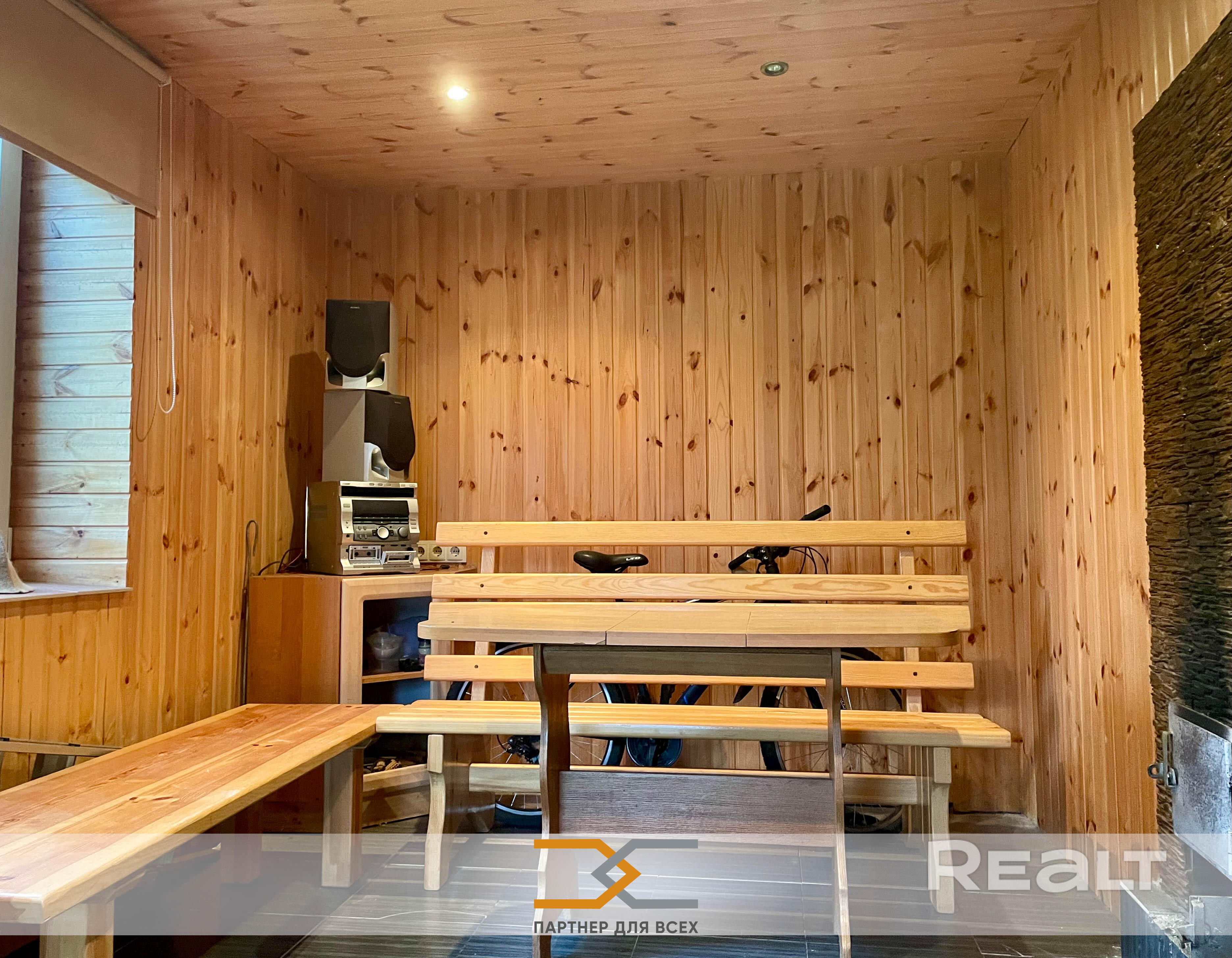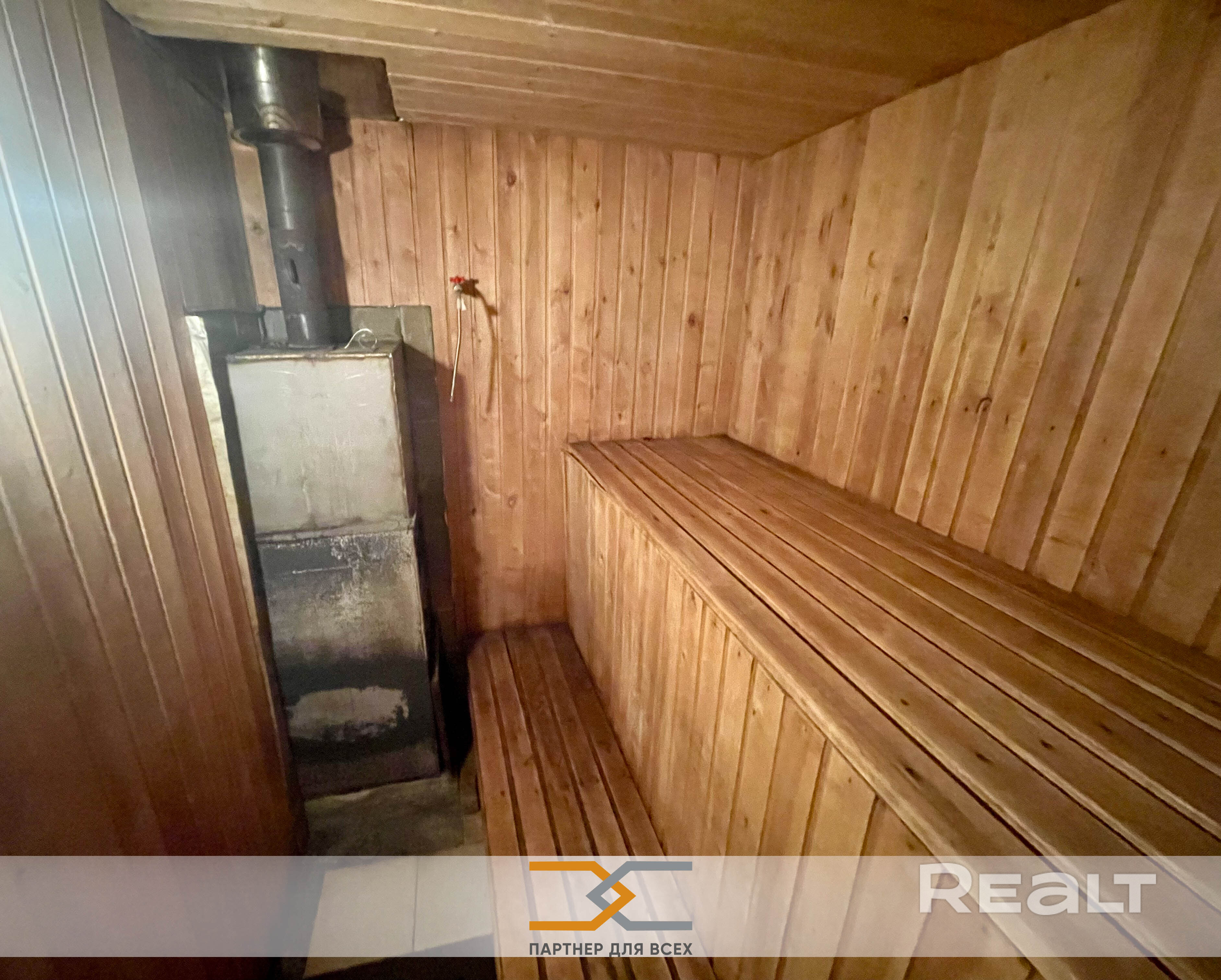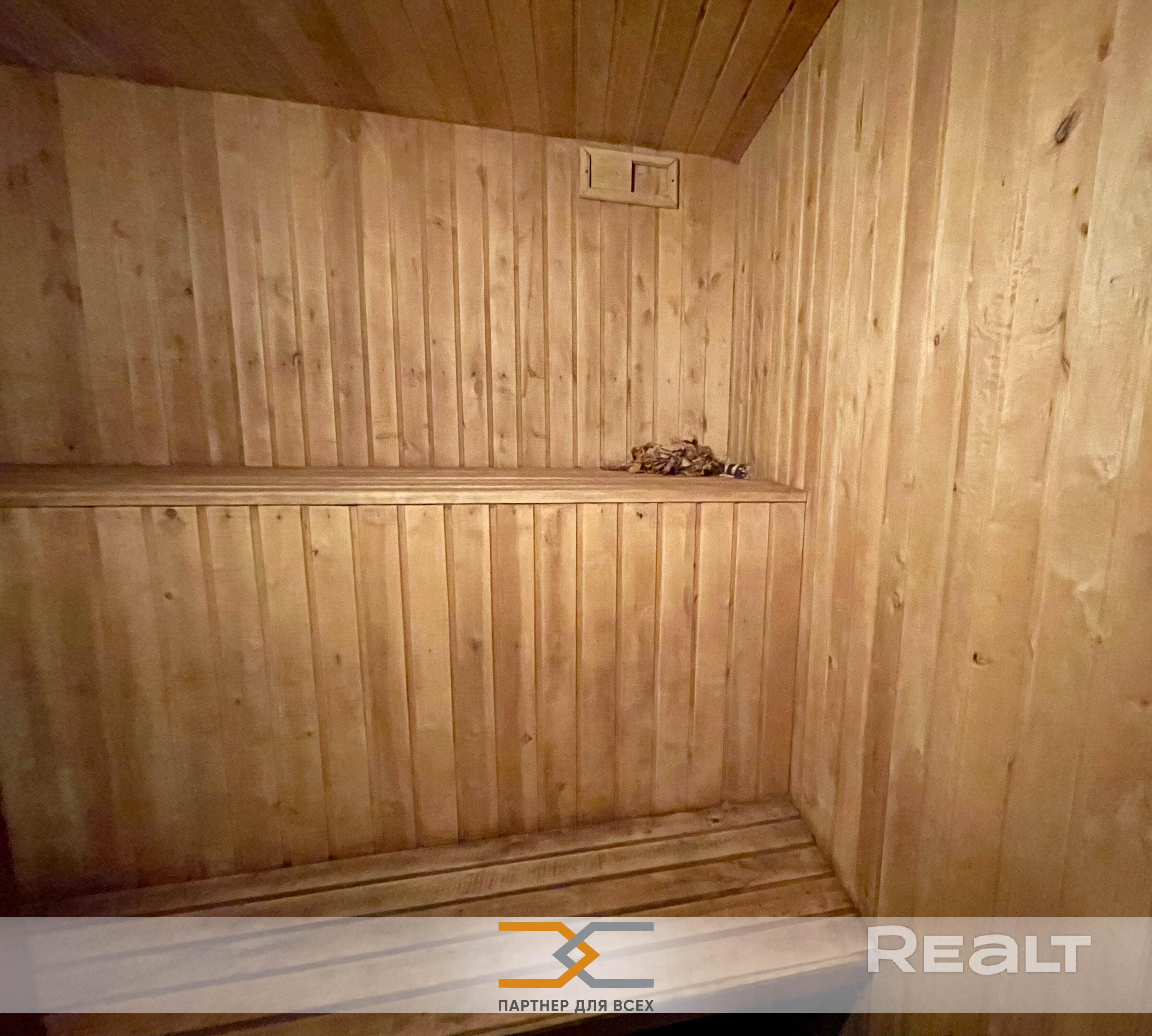 Баня – сложена из газосиликатных блоков, поштукатуренных снаружи. Баня обустроена лаунж-зоной, которая внутри отделана деревянными панелями, для создания здоровой и ароматной атмосферы. Вместительная парная хорошо удерживает тепло и обеспечивает комфорт. Имеется мансардный этаж, где организованна комната отдыха. К бане пристроена просторная терраса для отдыха на свежем воздухе.