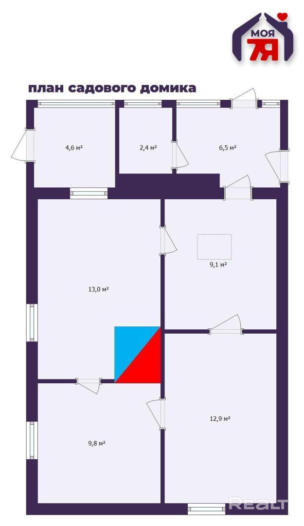 - Общая площадь дома составляет 58,3 кв.м., из которых жилая зона занимает 31,8 кв.м., а кухня – 13 кв.м.