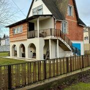 - Стены клались из блоков и кирпича, 2-ой этаж из блоков, фундамент — из ФСБ блоков, кровля — шифер. Железобетонное перекрытие.
