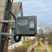 - Есть ворота для заезда автомобиля на участок. Также установлен электрический счётчик на столбе.