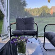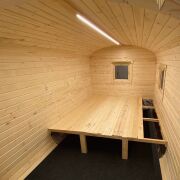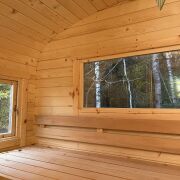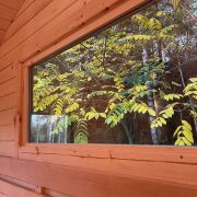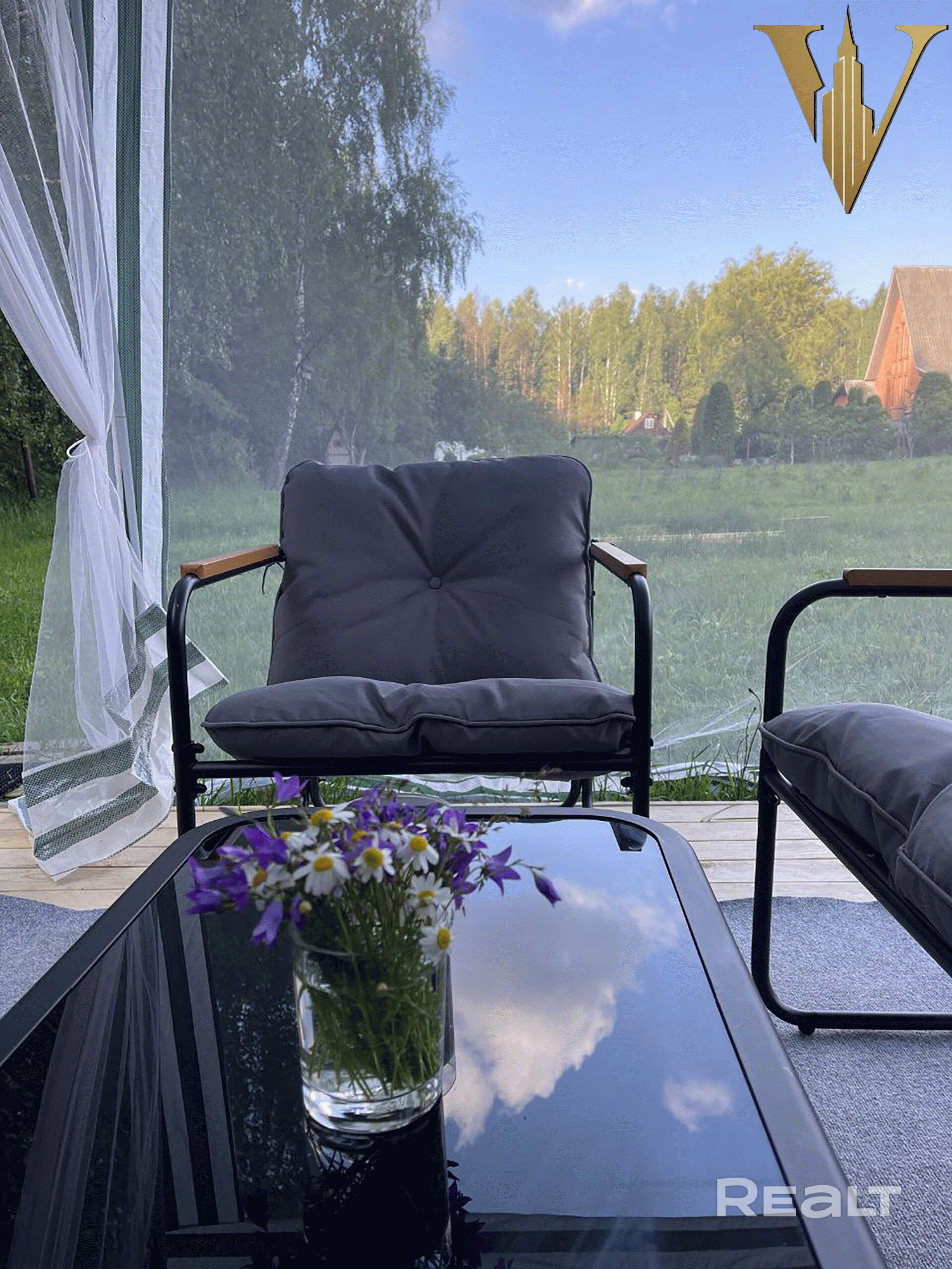 Дом раположен с другой стороны участка и состоит из спальни, кухни и санузла. Из дома открывается потрясающий вид на березовую рощу.