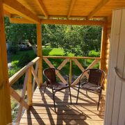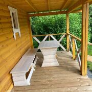На территории участка расположены: дом из бруса частично облицованный сайдингом с оштукатуренной блочной 2-х этажной пристройкой и террасой, гостевой дом (русская баня) с террасой, дровница.