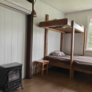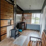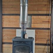 В доме установлена печь-камин с водяной рубашкой,  греет батареи в доме и горячую воду.