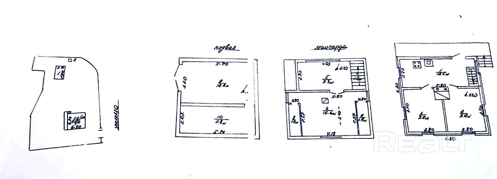 На первом этаже две комнаты и кухня, на мансарде две комнаты.