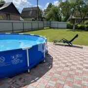 Большой и ровный участок правильной формы засеян газонной травой, имеются плодовые и декоративные деревья. Выложены дорожки из декоративной плитки, имеетя площадка под бассейн.