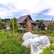 - Дом из блоков, с дощатой верандой, построенный в 2002 году, продуман до мелочей. В цокольной части находится сухой бетонный подвал для хранения заготовок и инвентаря. На первом этаже расположена светлая веранда с кухней и большая комната. Второй этаж занимает мансардное помещение, которое подойдёт для спальни или кабинета.
