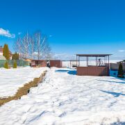 На участке высажен молодой сад, кусты голубики, цветы, декоративные растения и кусты, небольшой огородик, кусты клубники. Установлены качели из металла, хозблок металлический, вольер, мангал с навесом, беседка.