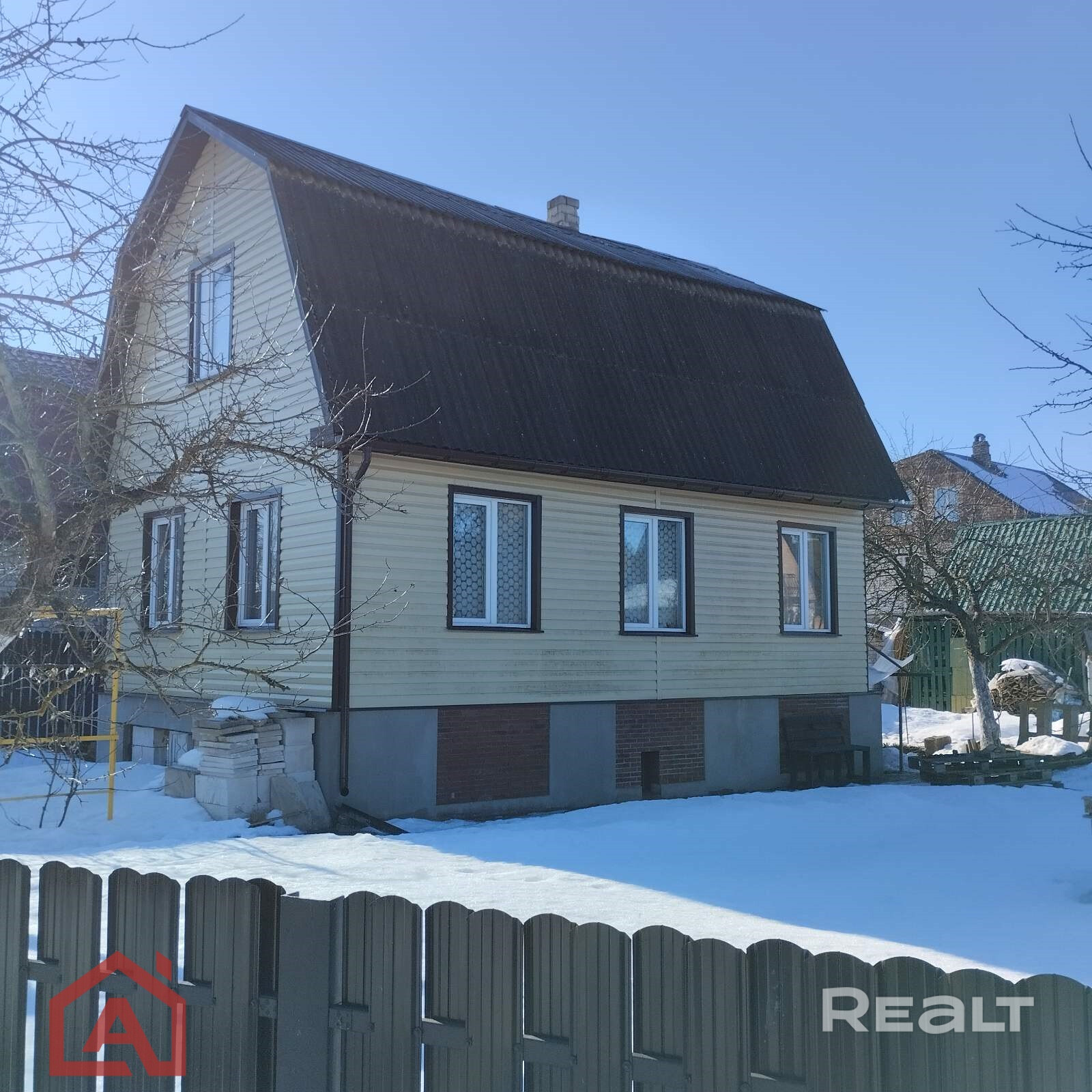 Дом 1995г. постройки из бревен утеплен и обшит металлическим сайдингом. Фундамент ленточный, цокольный этаж из блоков ФБС. Окна стеклопакеты, отопление печное. Пол доска, внутри дом обшит вагонкой. К дому подведена местная канализация. Вода сезонная, с/у на улице, свет 220 в.