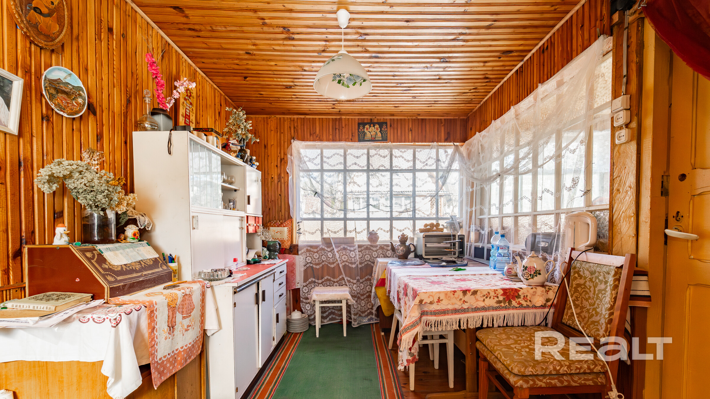 Дом деревянный, общей площадью 101,3 м.кв. На первом этаже расположены: кухня, большая гостиная, одна проходная комната и две раздельные. Лестница на второй этаж с удобным углом наклона, деревянная, удобная. На втором этаже одна большая раздельная комната. В доме много места для хранения.