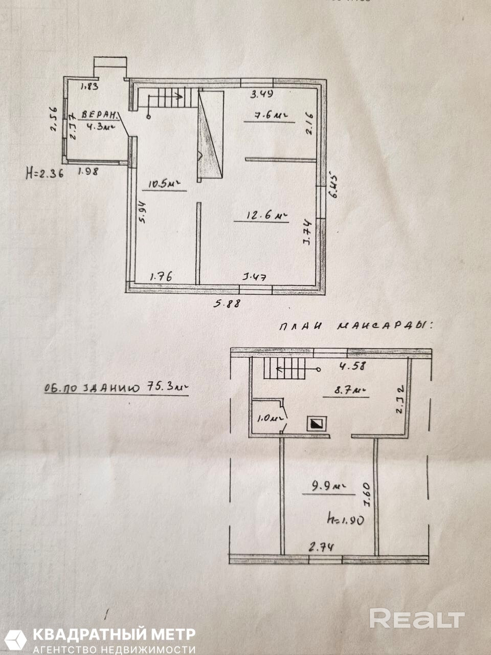Дом щитовой, обложенный кирпичом, двухэтажный, площадь – 75,3 м2. На первом этаже две комнаты и кухня, на втором этаже одна комната.