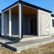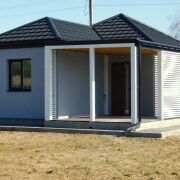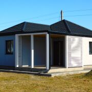 Общая площадь дома – 45 м2., кухня – гостиная 20 мкв., спальня – 9 квм., санузел – 4 мкв., прихожая – 2 м, веранда – 9 м.