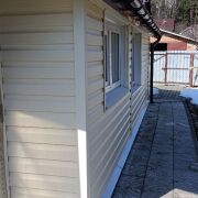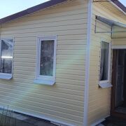 Оба дома обшиты пв сайдингом в одном стиле, крыша металлопрофиль под черепицу