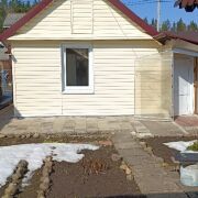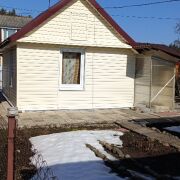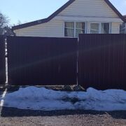 Ворота из металлопрофиля, есть парковочное место для авто сделано благоустройство уложена тротуарная плитка и бетонные жолоба для отвода воды. Так же предусмотрены продыхи для дома из ПВХ труб по периметру отмостки.