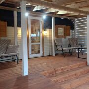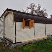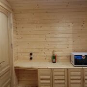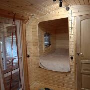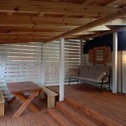 - Отделка: Все деревянные поверхности внутри и снаружи обработаны качественной защитной пропиткой и покрыты износостойким бесцветным матовым лаком или краской по дереву. Террасная доска также обработана немецким маслом и окрашена.