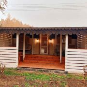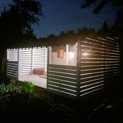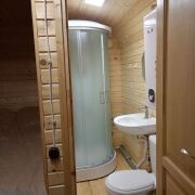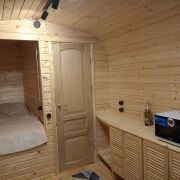 Первый домик (20 кв. м.) – это уютное пространство, продуманное до мелочей. Здесь вы найдете комфортное спальное место, уютную гостиную зону и собственный санузел. Из домика предусмотрен выход на просторную террасу, где так приятно проводить вечера в кругу близких или наслаждаться утренним кофе.