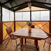 -Санузел вынесен в отдельное строение, но выполнен аккуратно и продуманно: плитка на полу, обшивка стен и потолка, окно, освещение.