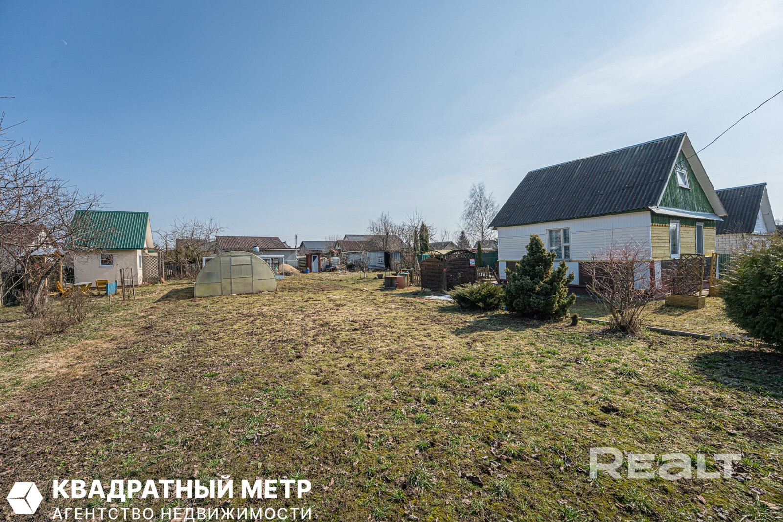 На участке есть теплица, туалет, сарай, беседки.