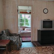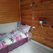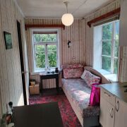 Дом деревянный сруб, с 2 жилыми комнатами, кухней и небольшой верандой. Комнаты обшиты светлой вагонкой, электричество везде в доме, на окнах жалюзи, пол деревянный, окна деревянные, есть русская печь, в комнатах остается вся мебель, в хорошем состоянии. Есть 3g интернет-модем (МТС). На ровном прямоугольном участке деревянный дом, хоз постройка с душем, бойлером, жилой комнатой, качели с навесом, беседка, мангал, туалет. Лес,озеро в 3 мин. ходьбы. Есть проблема с полом (прогиб) в 1 комнате.Торг!