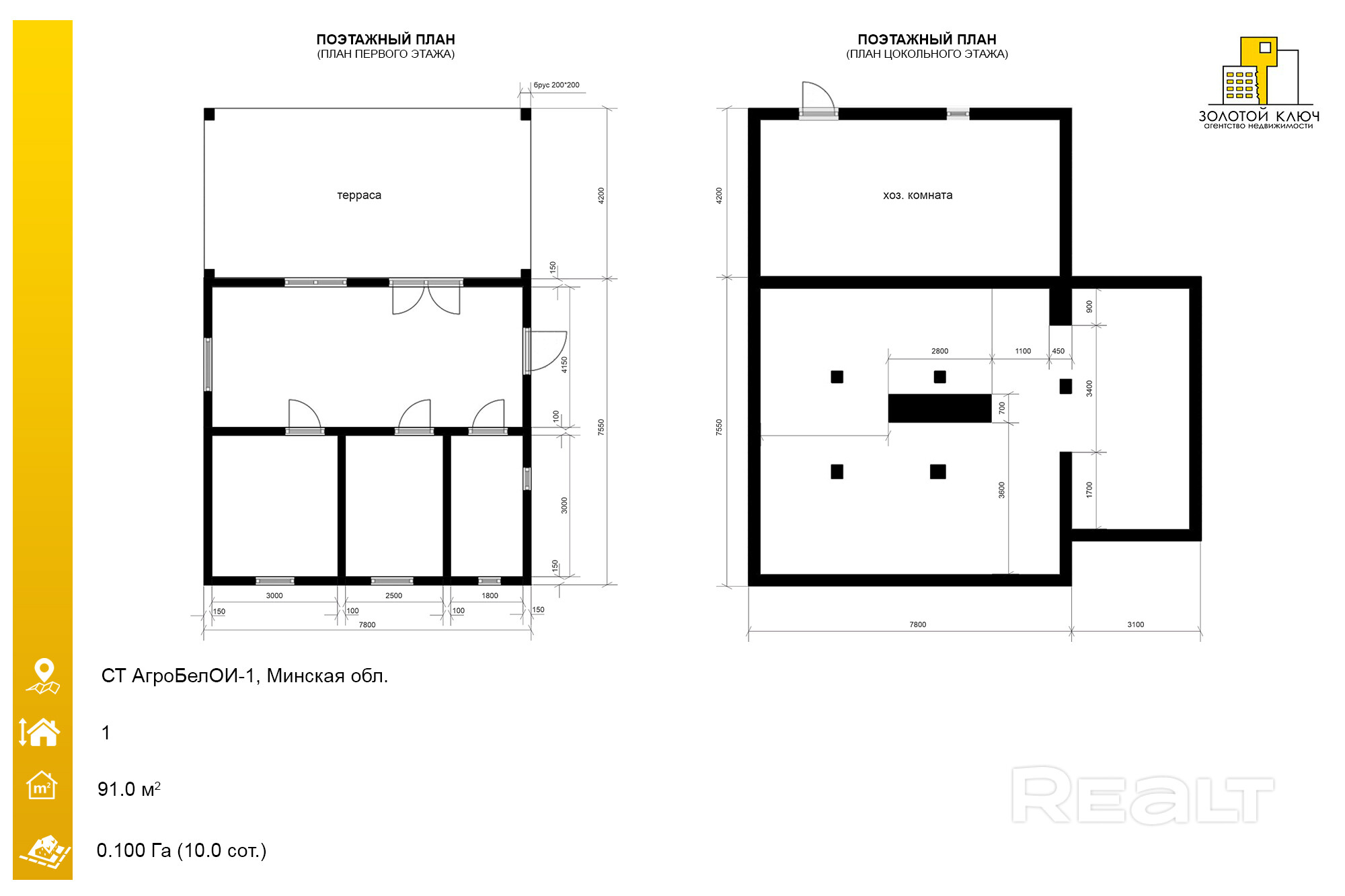 Общая площадь дома — 91 м2, плюс хозяйственное помещение около 26 м2 (на фундаменте 3,6×7,2 м).