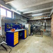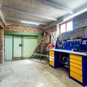 - Первый уровень — ФБС с монолитными железобетонными перекрытиями. На нем расположены гараж с верстаком, огромным арсеналом техники и оборудования, дополнительные складские помещения и погреб.