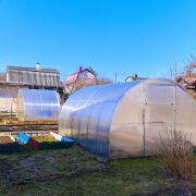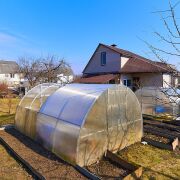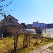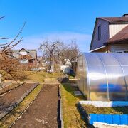 Участок площадью 5,4 сотки в частной собственности с огородом, двумя теплицами и многолетними плодово-ягодными деревьями.