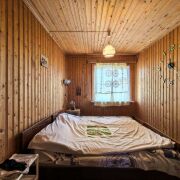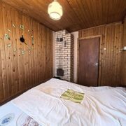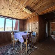 Внутри дом обшит вагонкой. На кухне установлен функциональный гарнитур, есть холодильник, микроволновая печь, электрическая плитка.