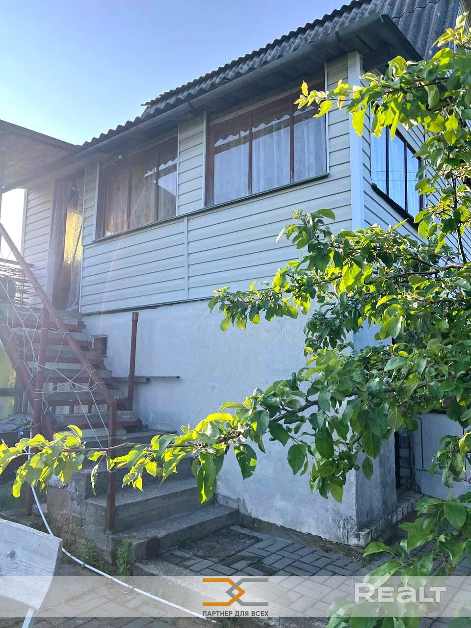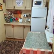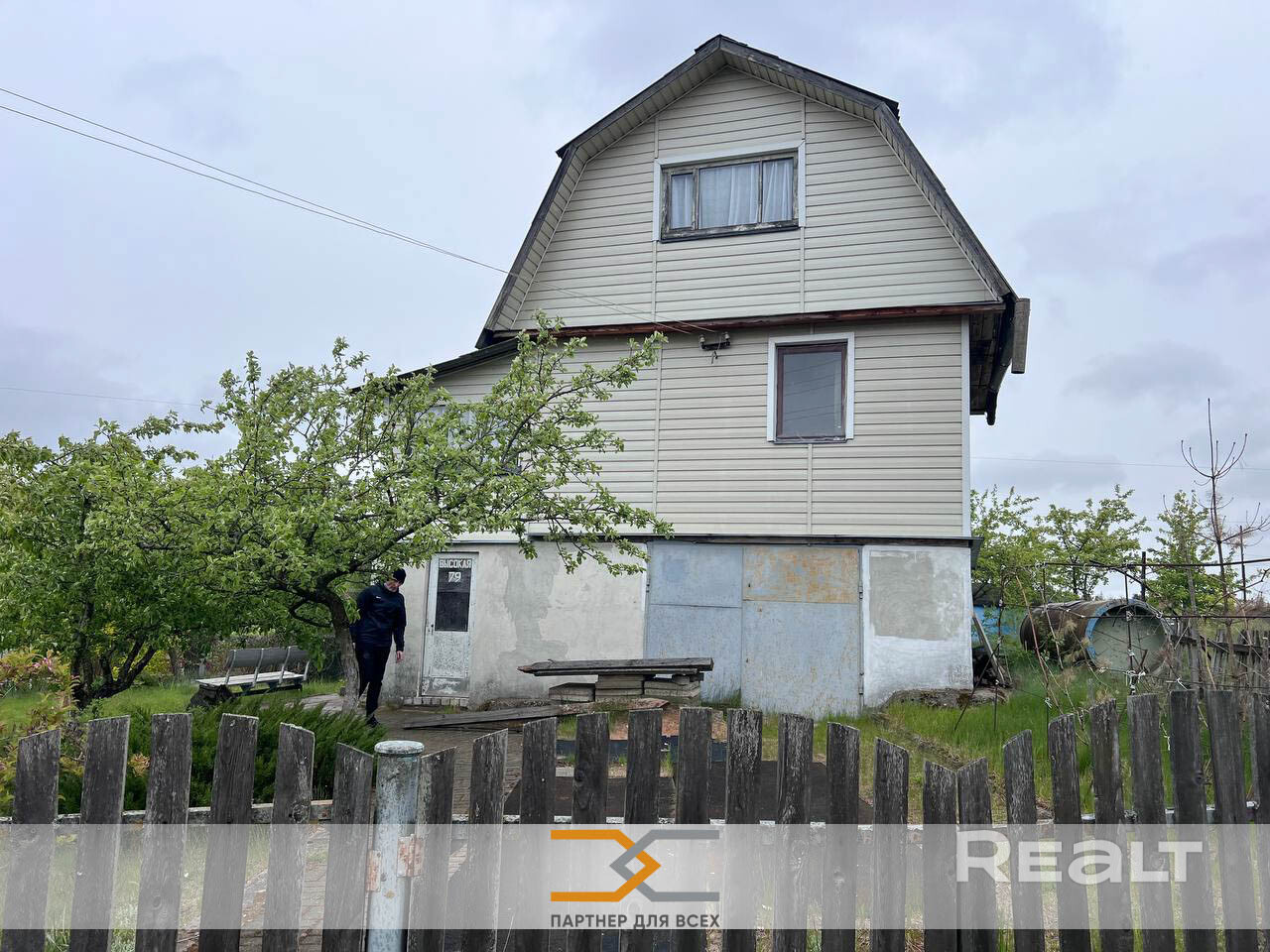Дом щитовой, 1993 года постройки, обшит сайдингом, 1 этаж – гараж, 2 этаж – веранда, кухня и спальня, 3 этаж – спальня с балконом, крыша из шифера. Общая площадь 53м2, площадь кухни 12м2. В доме 2 спальни и просторная светлая веранда.  Есть электричество, вода сезонная, проведена с участка в дом, уборная на улице.
