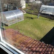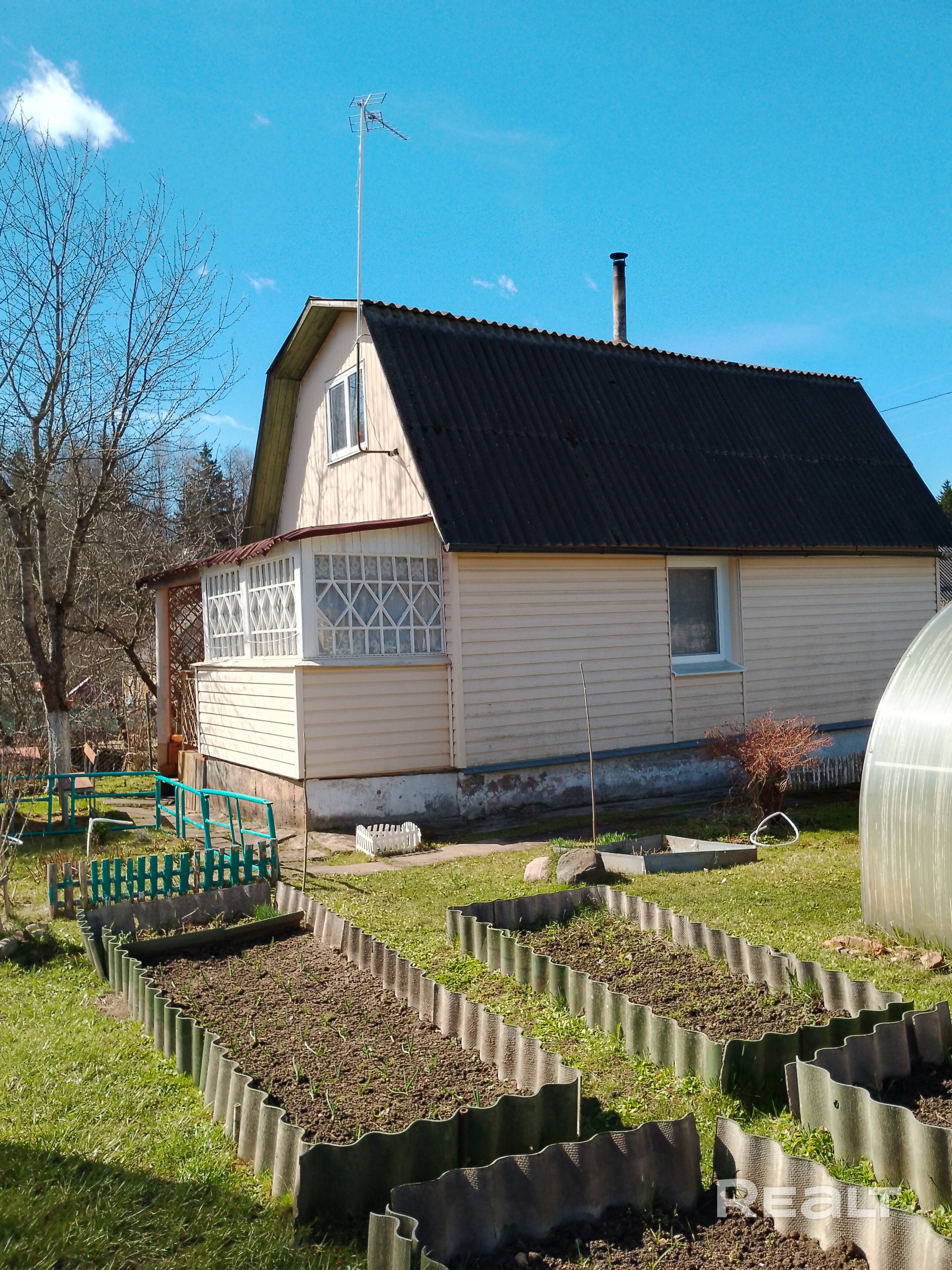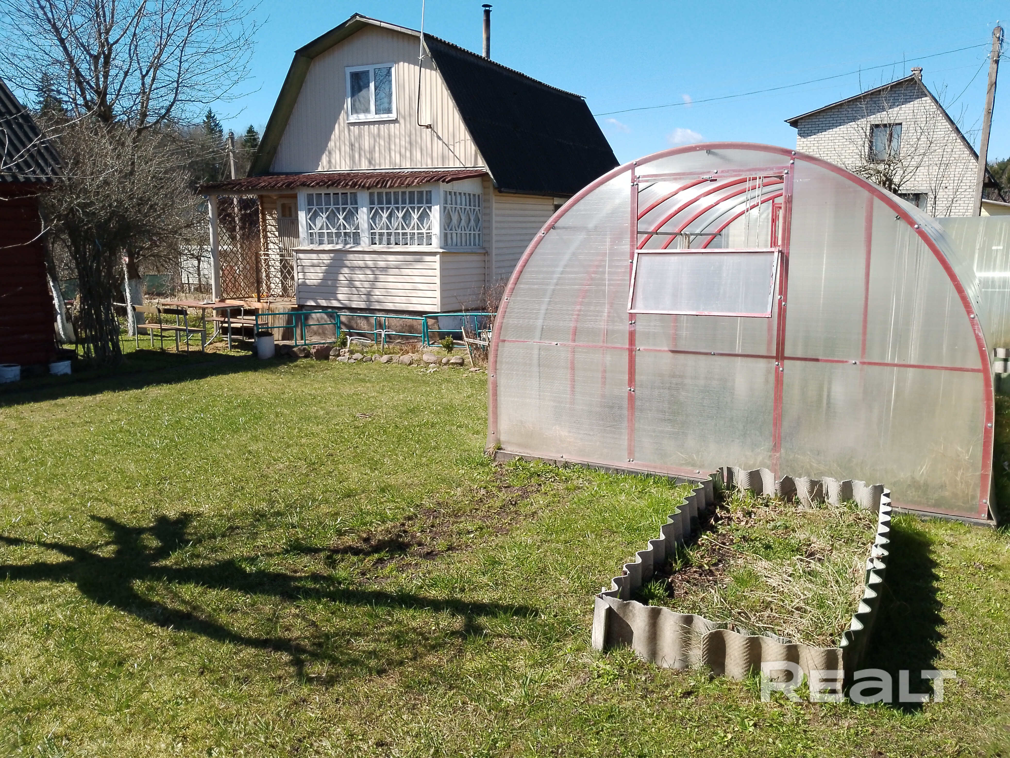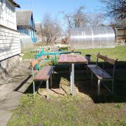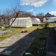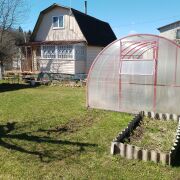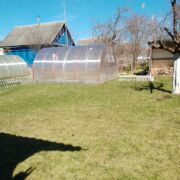 Две большие теплицы, разработанные грядки. Из насаждений: яблоня, кусты смородины, много декоративных растений. Ограждение с 3-х сторон сеткой рабицой. Уютное место для отдыха со столом и скамейками перед домом.