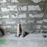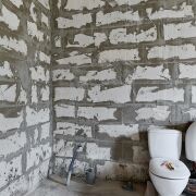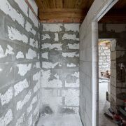 Незавершенная будущая баня на участке, фундамент и часть коробки стоят.