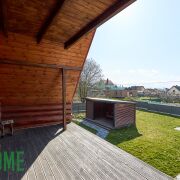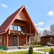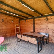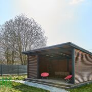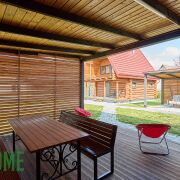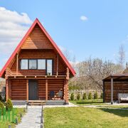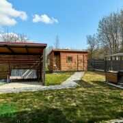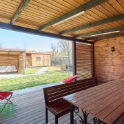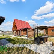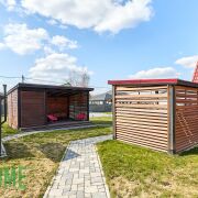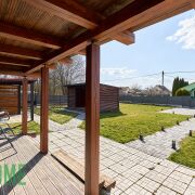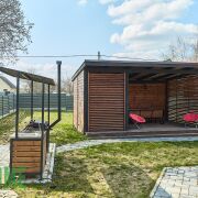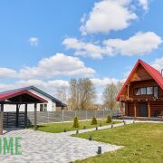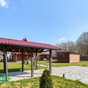 На участке расположены: навес для машины, беседка, барбекю, садовые качели, хозблок.