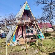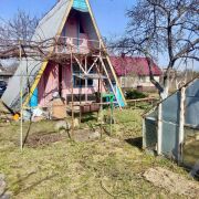 На участке расположен двухэтажный садовый домик, площадью 27 метров квадратных. Двускатная крыша, стены и перегородки - дерево.