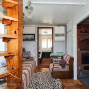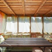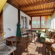На первом этаже располагается просторная деревянная террасса с мягкими окнами и системой хранения. Зона кухни-столовой оборудована новой мебелью, имеет окно на террасу, что важно при организации различных мероприятий на свежем воздухе. Холодильник с системой no frost.