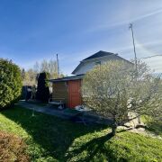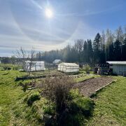 Территория ухоженная. Имеются грядки, две теплицы, множество фруктовых деревьев, ягодных кустов. Сделано красивое место для отдыха с садовыми качелями. Есть гараж для машины.