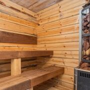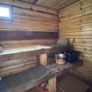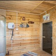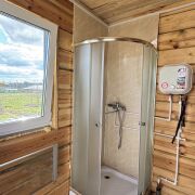 На участке расположена уютная баня из цельного бревна сосны, которая станет настоящим оазисом комфорта и релаксации. Современная душевая кабина.