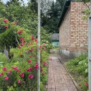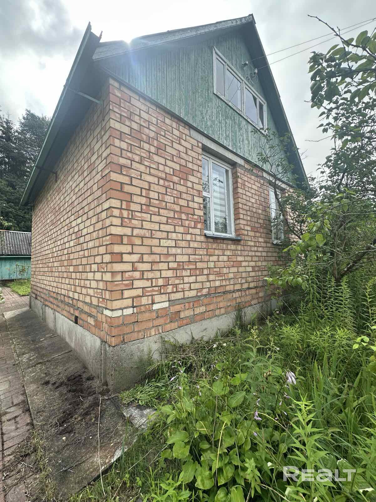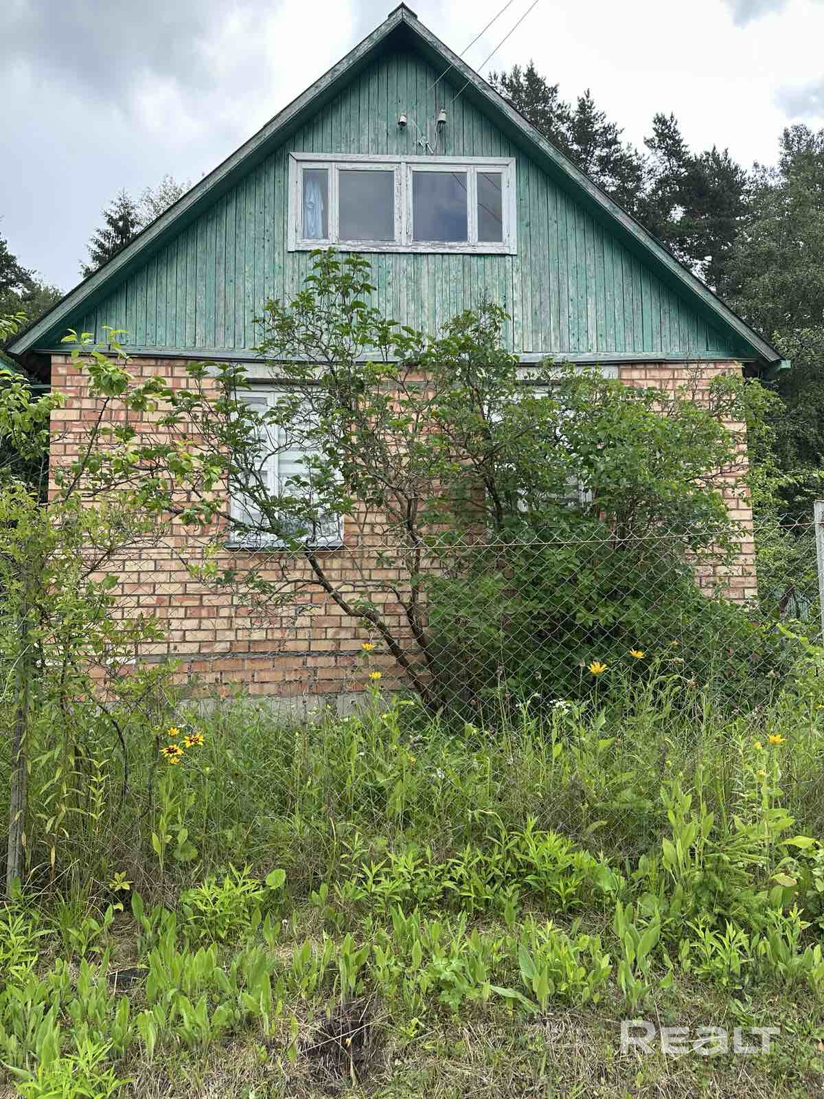 1. Одноэтажный щитовой садовый дом, обложенный красным кирпичем, с мансардой и пристойкой - общей площадью 72 м2;