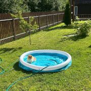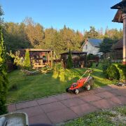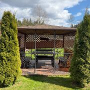 Места отдыха оборудованы стильными качелями, беседкой, мангальной зоной, батутом. Есть садовая пристройка, где хранится садовый инвентарь, газонокосилка, тримеры, тачка и пр. – всё отдается вместе с дачей.