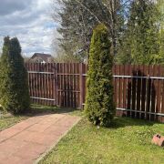Ворота распашные, две калитки, на парковочном месте уложена плитка. Прореженный забор визуально расширяет пространство участка.