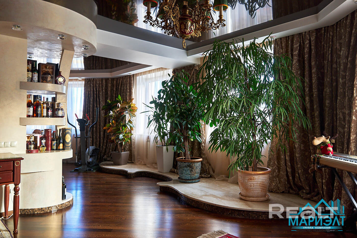В квартире произведена и узаконена перепланировка- кухня, гостиная и комната отдыха с камином объединены в единое пространство.
