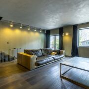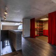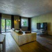 1-ый уровень – отапливаемый гараж с отдельным входом, из которого попадаешь в квартиру. Гараж, по желанию, можно переоборудовать в еще одну комнату, так как с внешней стороны таунхауса имеется придомовая закрытая территория с открытой парковкой. Вместительная гардеробная, которая отделена от комнаты прозрачной перегородкой. Из комнаты на первом уровне можно выйти во внутренний дворик с ландшафтным дизайном. Также на 1-ом уровне расположен санузел и хозяйственный блок.